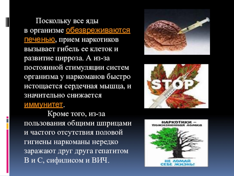 Слайд 9 Поскольку все яды в организме обезвреживаются печенью, прием наркотиков вызывает гибель ее