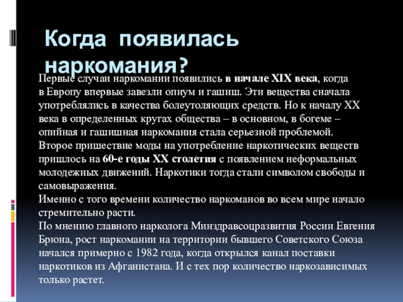 По мнению главного нарколога Минздравсоцразвития России Евгения Брюна, рост наркомании на территории бывшего Советского Союза начался примерно с 1982 года, когда открылся канал поставки наркотиков из Афганистана. И с тех пор количество наркозависимых только растет.