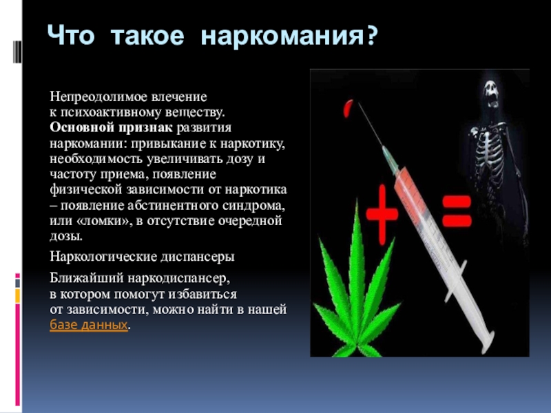Непреодолимое влечение к психоактивному веществу. Основной признак развития наркомании: привыкание