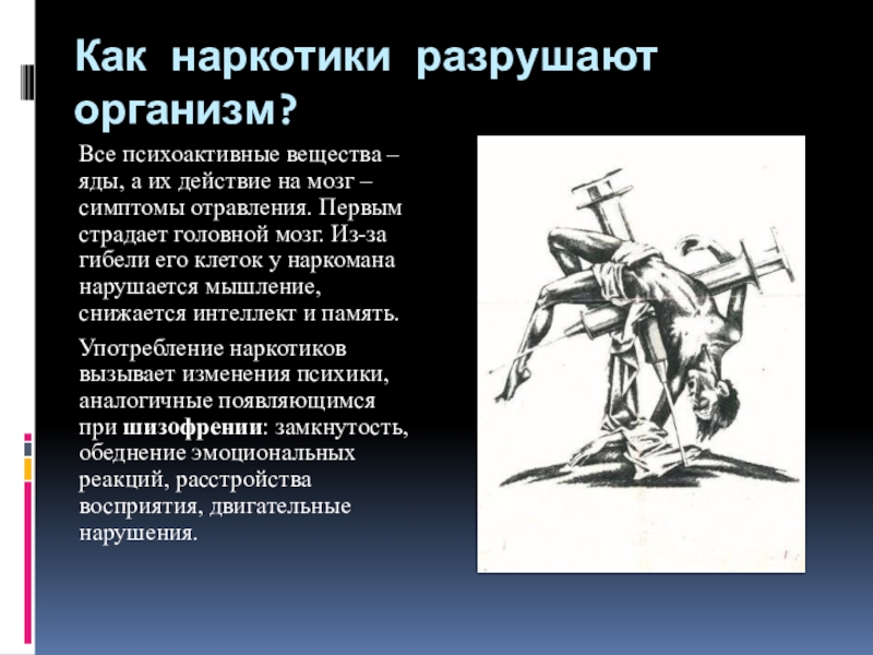 Употребление наркотиков вызывает изменения психики, аналогичные появляющимся при шизофрении: замкнутость, обеднение эмоциональных реакций, расстройства восприятия, двигательные нарушения.