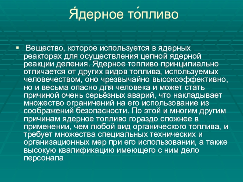 ядерной реакции деления. Ядерное топливо принципиально отличается от других видов топлива, используемых человечеством, оно чрезвычайно высокоэффективно, но и весьма опасно для человека и может стать причиной очень серьёзных аварий, что накладывает множество ограничений на его использование из соображений безопасности. По этой и многим другим причинам ядерное топливо гораздо сложнее в применении, чем любой вид органического топлива, и требует множества специальных технических и организационных мер при его использовании, а также высокую квалификацию имеющего с ним дело персонала