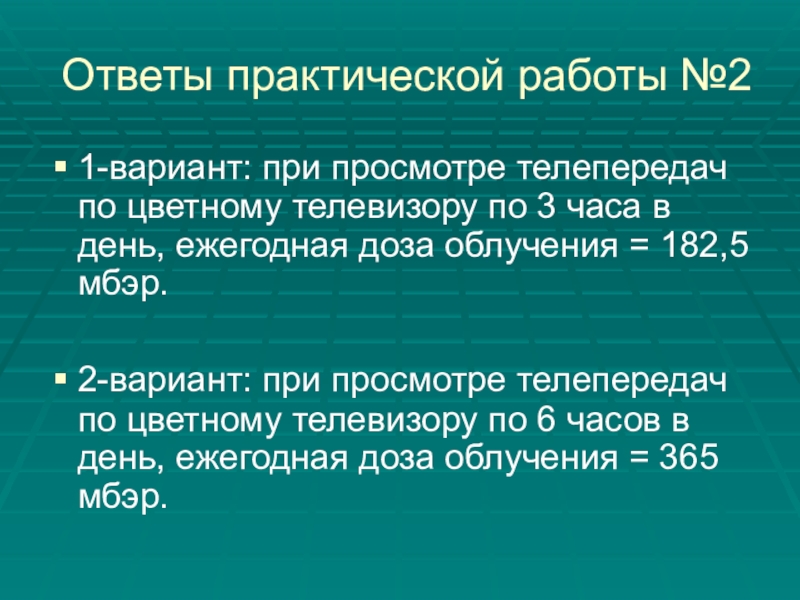 2-вариант: вычислите, какую дозу облучения в течении года получают при просмотре телепередач ежедневно по 6 часов.