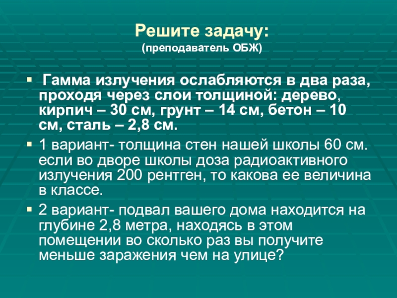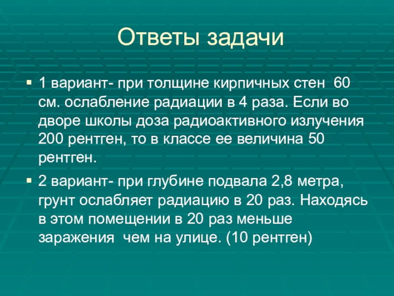 1 вариант- толщина стен нашей школы 60 см. если во дворе школы доза радиоактивного излучения 200 рентген, то какова ее величина в классе.