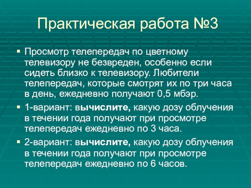 1-вариант: вычислите, какую дозу облучения в течении года получают при просмотре телепередач ежедневно по 3 часа.