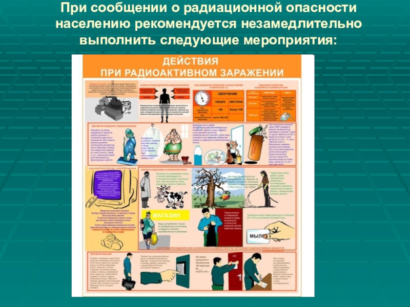Слайд 34При сообщении о радиационной опасности населению рекомендуется незамедлительно выполнить следующие мероприятия: