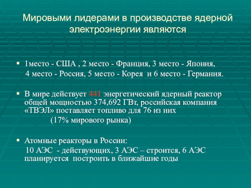 Слайд 8Мировыми лидерами в производстве ядерной электроэнергии являются