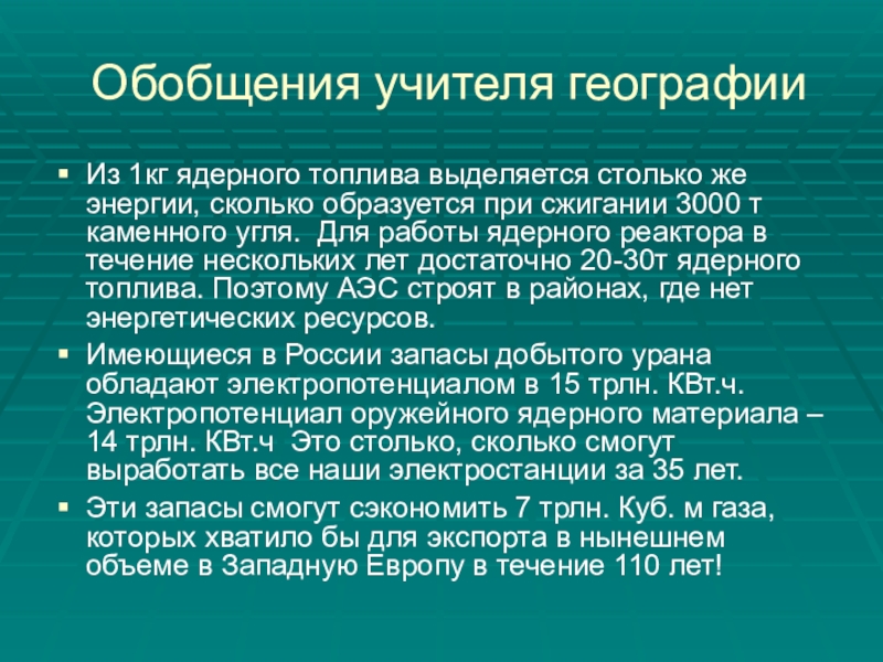 сколько образуется при сжигании 3000 т каменного угля. Для работы ядерного реактора в течение нескольких лет достаточно 20-30т ядерного топлива. Поэтому АЭС строят в районах, где нет энергетических ресурсов.