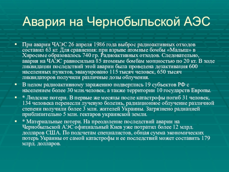 * Людские потери. В первые же месяцы после катастрофы погиб 31 человек, 134 человека перенесли лучевую болезнь, радиационное облучение различной степени получили более 3 млн. жителей Украины. Загрязнено радиацией приблизительно 5 млн. гектаров украинской земли.