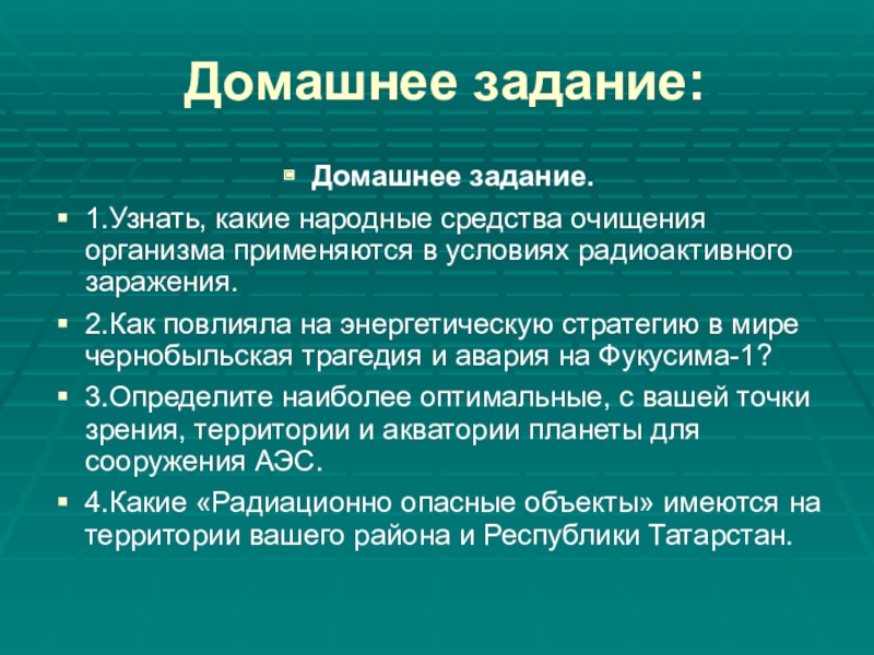 - ознакомить учащихся с основными проблемами электроэнергетики: экономическими, экологическими и социальными, с радиоактивно-опасными объектами и источниками радиации;