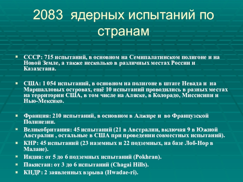 США: 1 054 испытаний, в основном на полигоне в штате Невада и на Маршалловых островах, ещё 10 испытаний проводились в разных местах на территории США, в том числе на Аляске, в Колорадо, Миссисипи и Нью-Мексико.