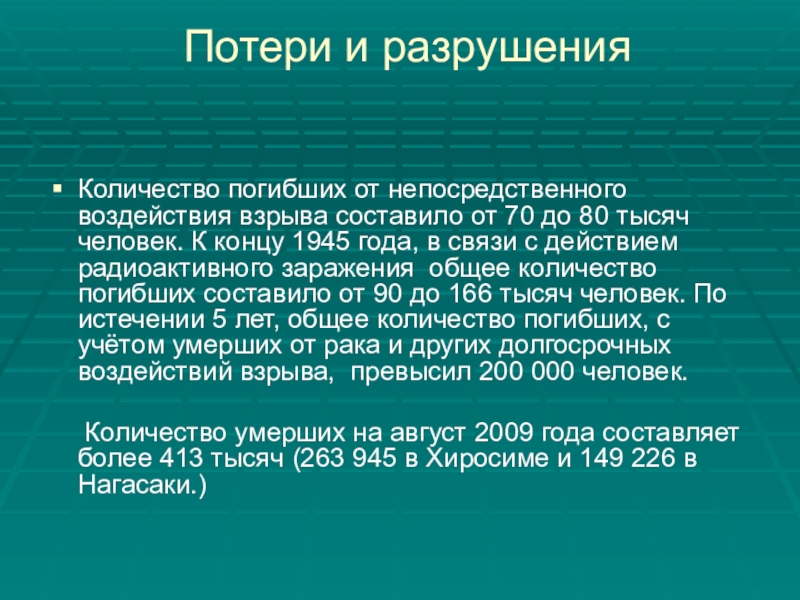 до 80 тысяч человек. К концу 1945 года, в связи с действием радиоактивного заражения общее количество погибших составило от 90 до 166 тысяч человек. По истечении 5 лет, общее количество погибших, с учётом умерших от рака и других долгосрочных воздействий взрыва, превысил 200 000 человек.