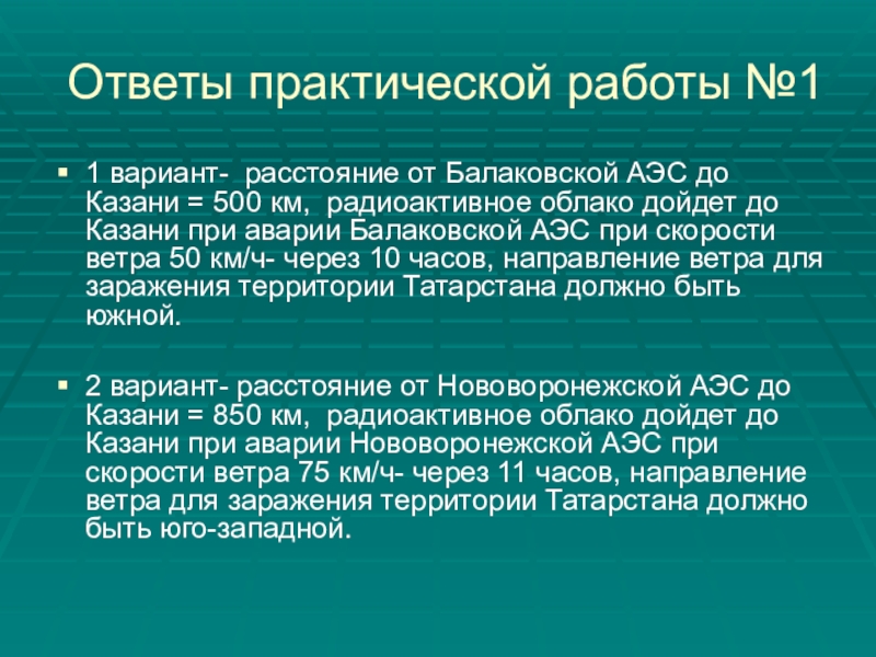 2 вариант- расстояние от Нововоронежской АЭС до Казани = 850 км, радиоактивное облако дойдет до Казани при аварии Нововоронежской АЭС при скорости ветра 75 км/ч- через 11 часов, направление ветра для заражения территории Татарстана должно быть юго-западной.
