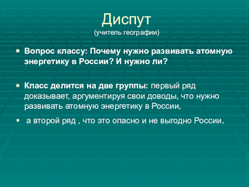 Класс делится на две группы: первый ряд доказывает, аргументируя свои доводы, что нужно развивать атомную энергетику в России,