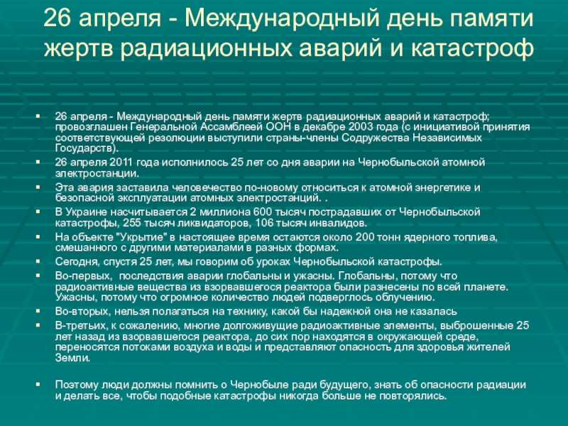 Слайд 3126 апреля - Международный день памяти жертв радиационных аварий и катастроф
