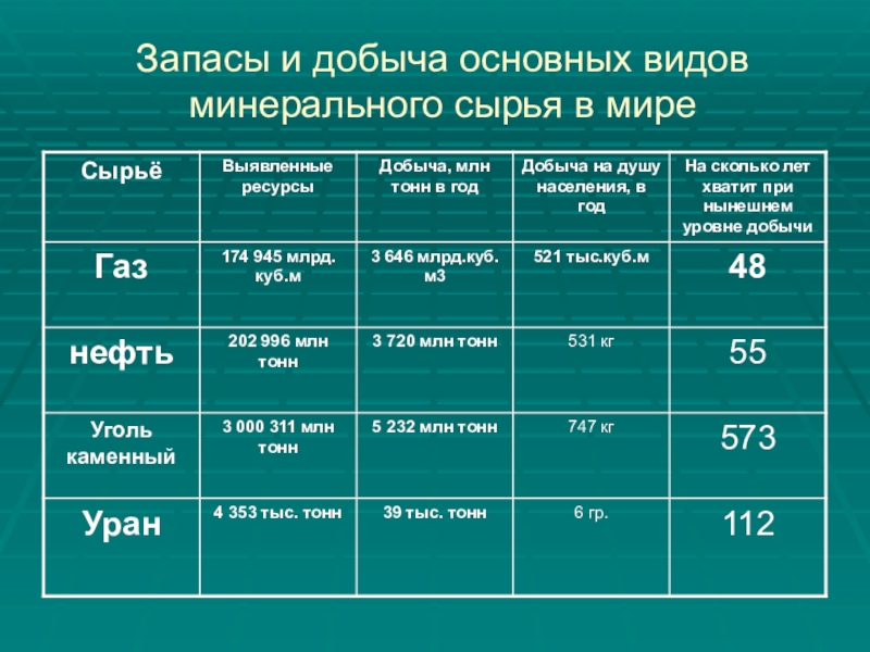 Слайд 5Запасы и добыча основных видов минерального сырья в мире
