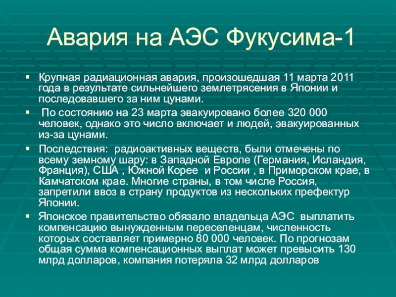 Последствия: радиоактивных веществ, были отмечены по всему земному шару: в Западной Европе (Германия, Исландия, Франция), США , Южной Корее и России , в Приморском крае, в Камчатском крае. Многие страны, в том числе Россия, запретили ввоз в страну продуктов из нескольких префектур Японии.
