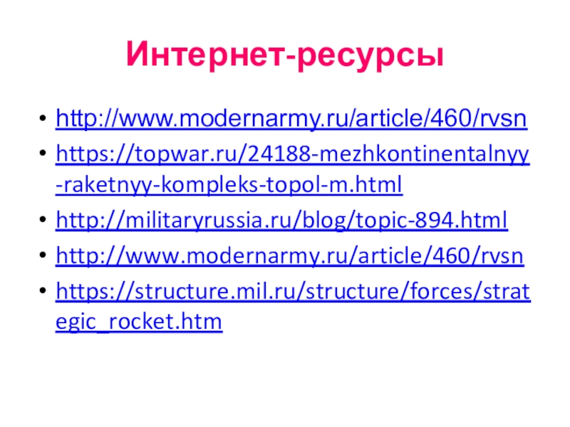 Интернет-ресурсыhttp://www.modernarmy.ru/article/460/rvsnhttps://topwar.ru/24188-mezhkontinentalnyy-raketnyy-kompleks-topol-m.htmlhttp://militaryrussia.ru/blog/topic-894.htmlhttp://www.modernarmy.ru/article/460/rvsnhttps://structure.mil.ru/structure/forces/strategic_rocket.htm