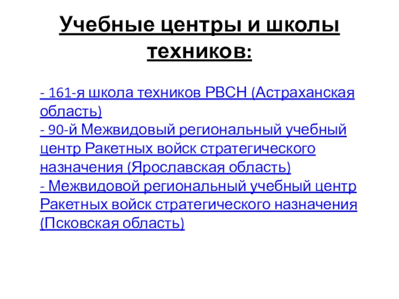 Учебные центры и школы техников:- 161-я школа техников РВСН (Астраханская область) - 90-й Межвидовый региональный учебный центр