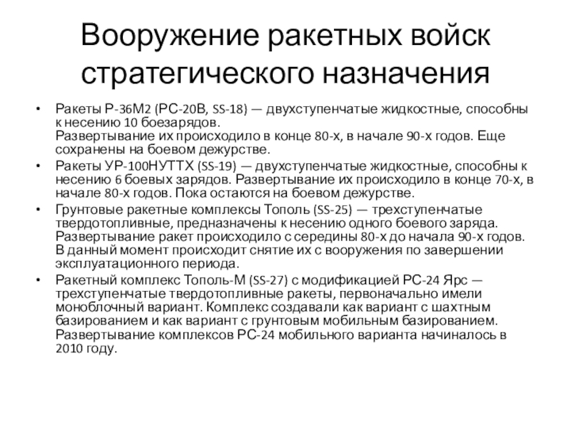 Вооружение ракетных войск стратегического назначенияРакеты Р-36М2 (РС-20В, SS-18) — двухступенчатые жидкостные, способны к несению 10 боезарядов. Развертывание