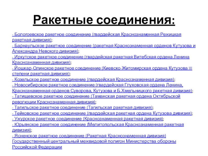 ракетное соединение (ракетная Краснознаменная орденов Кутузова и Александра Невского дивизия); - Иркутское ракетное соединение (гвардейская ракетная Витебская ордена Ленина Краснознаменная дивизия); - Йошкар-Олинское ракетное соединение (Киевско-Житомирская ордена Кутузова III степени ракетная дивизия); - Козельское ракетное соединение (гвардейская Краснознаменная дивизия); - Новосибирское ракетное соединение (гвардейская Глуховская ордена Ленина, Краснознаменная орденов Суворова, Кутузова и Б.Хмельницкого ракетная дивизия); - Татищевское ракетное соединение (Таманская ракетная ордена Октябрьской революции Краснознаменная дивизия); - Тагильское ракетное соединение (Тагильская ракетная дивизия); - Тейковское ракетное соединение (гвардейская ракетная ордена Кутузова дивизия); - Ужурское ракетное соединение (Краснознаменная ракетная дивизия); - Юрьянское ракетное соединение (Мелитопольская Краснознаменная ракетная дивизия); - Ясненское ракетное соединение (Ракетная Краснознаменная дивизия)