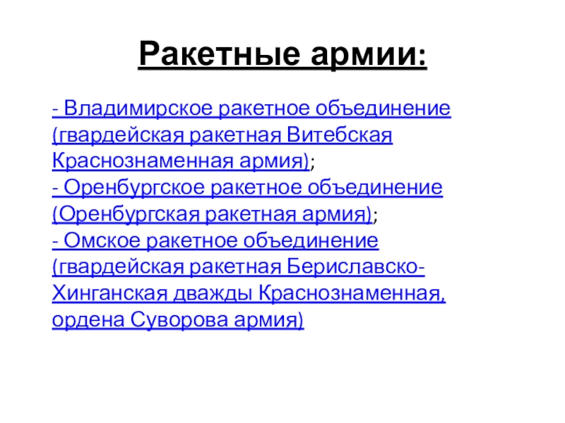 - Владимирское ракетное объединение (гвардейская ракетная Витебская Краснознаменная армия); - Оренбургское