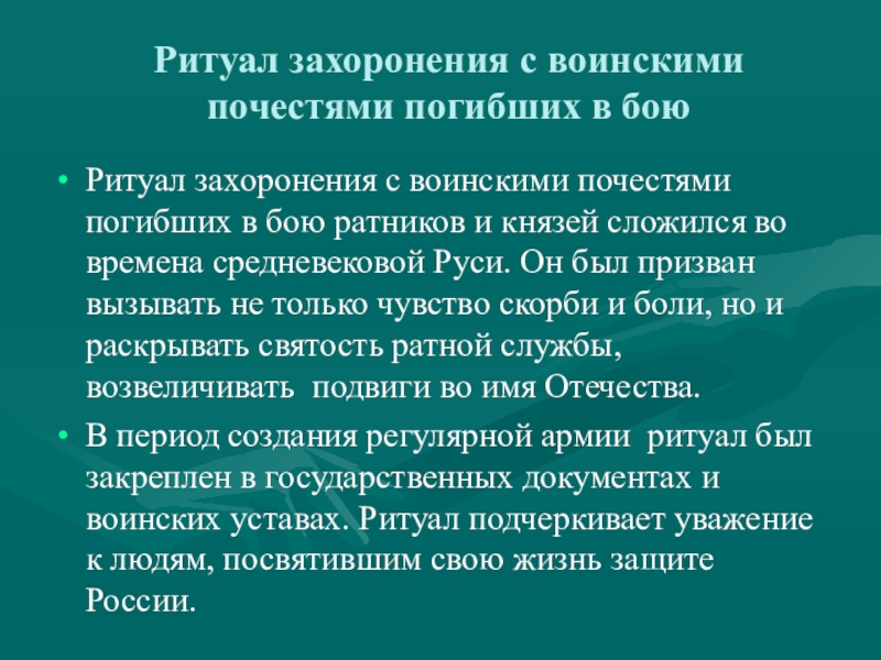 почестями погибших в бою ратников и князей сложился во времена средневековой Руси. Он был призван вызывать не только чувство скорби и боли, но и раскрывать святость ратной службы, возвеличивать подвиги во имя Отечества.