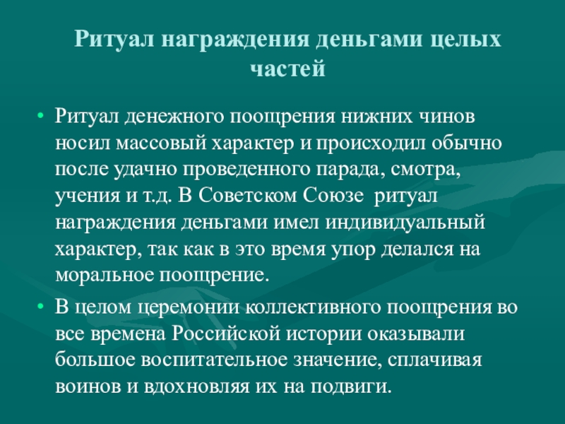 характер и происходил обычно после удачно проведенного парада, смотра, учения и т.д. В Советском Союзе ритуал награждения деньгами имел индивидуальный характер, так как в это время упор делался на моральное поощрение.