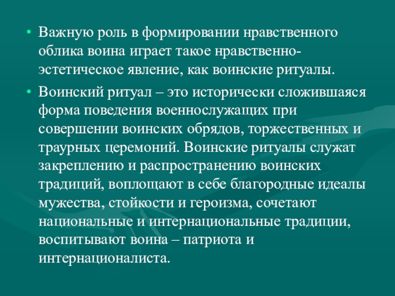 Воинский ритуал – это исторически сложившаяся форма поведения военнослужащих при совершении воинских обрядов, торжественных и траурных церемоний. Воинские ритуалы служат закреплению и распространению воинских традиций, воплощают в себе благородные идеалы мужества, стойкости и героизма, сочетают национальные и интернациональные традиции, воспитывают воина – патриота и интернационалиста.
