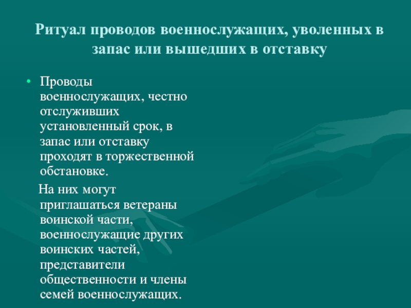 Слайд 14Ритуал проводов военнослужащих, уволенных в запас или вышедших в отставку