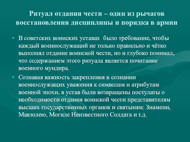 Слайд 10Ритуал отдания чести – один из рычагов восстановления дисциплины и порядка
