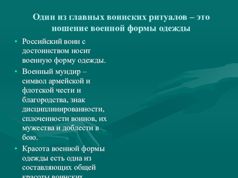 Слайд 9Один из главных воинских ритуалов – это ношение военной формы одежды
