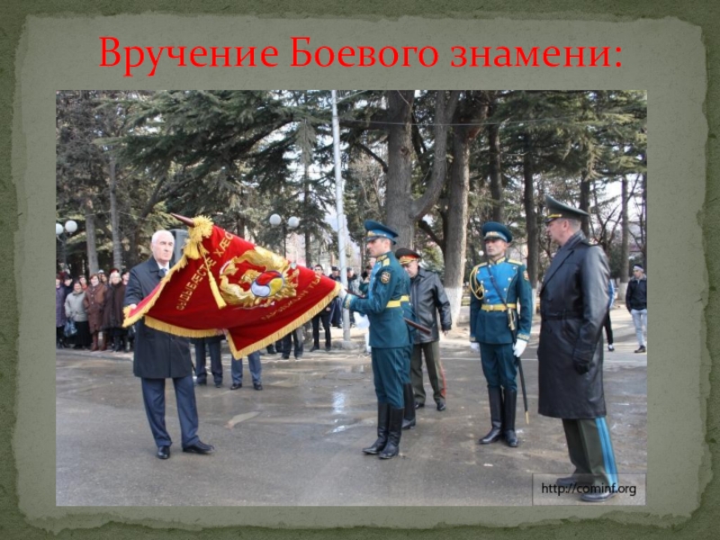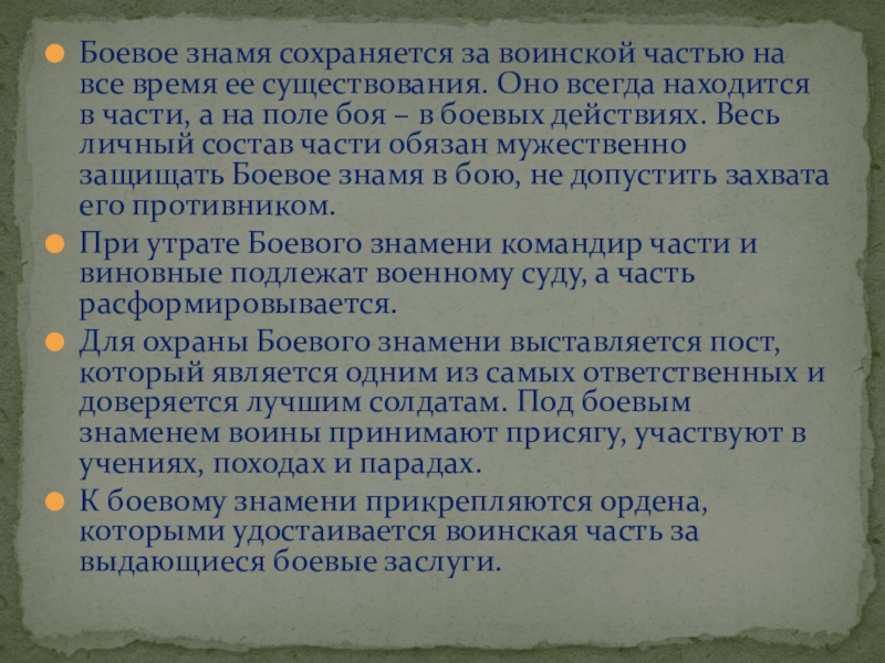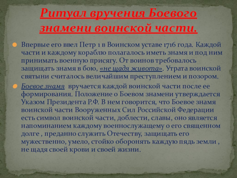 Боевое знамя вручается каждой воинской части после ее формирования. Положение о Боевом знамени утверждается Указом Президента Р.Ф. В нем говорится, что Боевое знамя воинской части Вооруженных Сил Российской Федерации есть символ воинской части, доблести, славы, оно является напоминанием каждому военнослужащему о его священном долге , преданно служить Отечеству, защищать его мужественно, умело, стойко оборонять каждую пядь земли , не щадя своей крови и своей жизни.