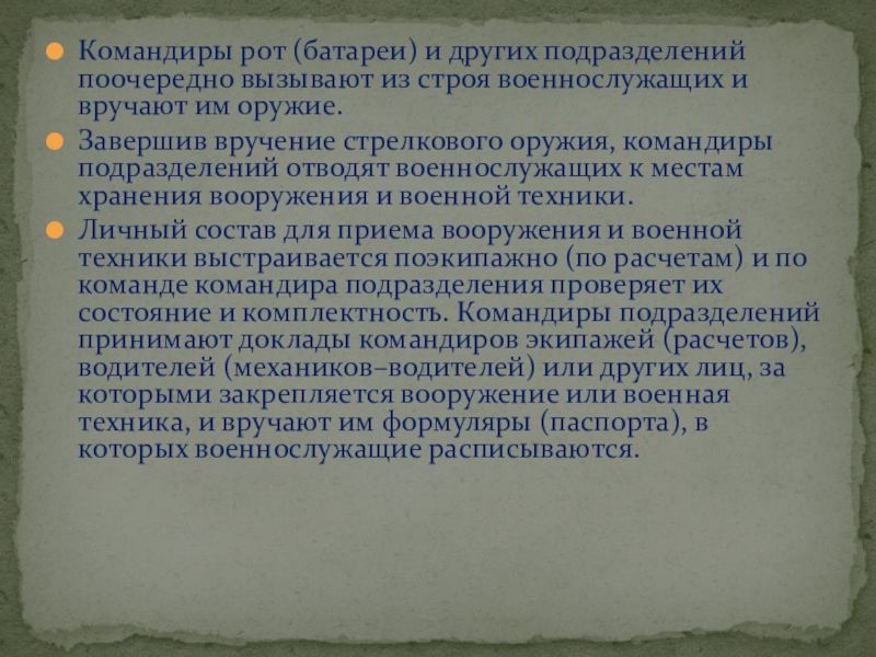 Затем объявляют приказ о закреплении вооружения и военной техники за членами экипажей (расчетов), водителями и другими должностными лицами подразделений, и командир части приказывает командирам подразделений приступить к вручению стрелкового оружия.
