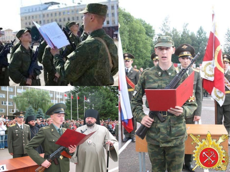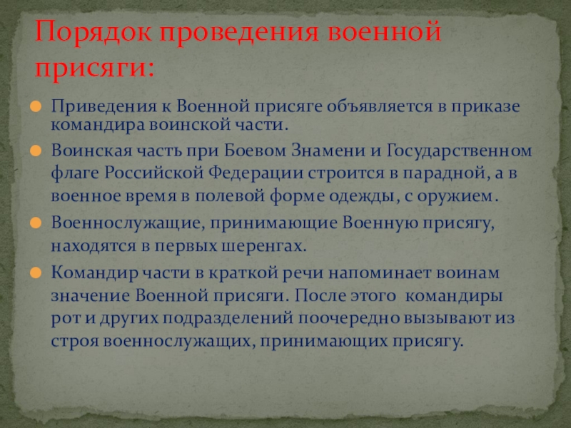 Слайд 12Приведения к Военной присяге объявляется в приказе командира воинской части.