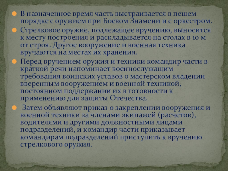 Слайд 22В назначенное время часть выстраивается в пешем порядке с оружием при