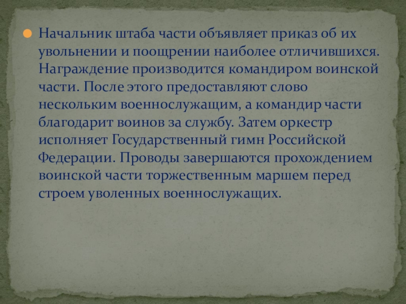 отличившихся. Награждение производится командиром воинской части. После этого предоставляют слово нескольким военнослужащим, а командир части благодарит воинов за службу. Затем оркестр исполняет Государственный гимн Российской Федерации. Проводы завершаются прохождением воинской части торжественным маршем перед строем уволенных военнослужащих.
