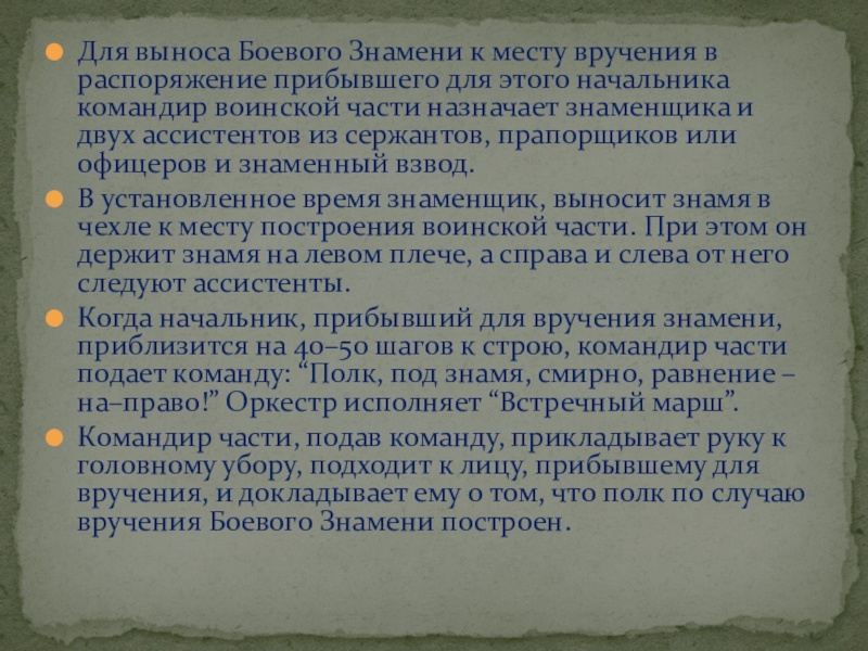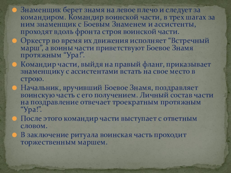 Когда начальник, прибывший для вручения знамени, приблизится на 40–50 шагов к строю, командир части подает команду: “Полк, под знамя, смирно, равнение – на–право!” Оркестр исполняет “Встречный марш”.