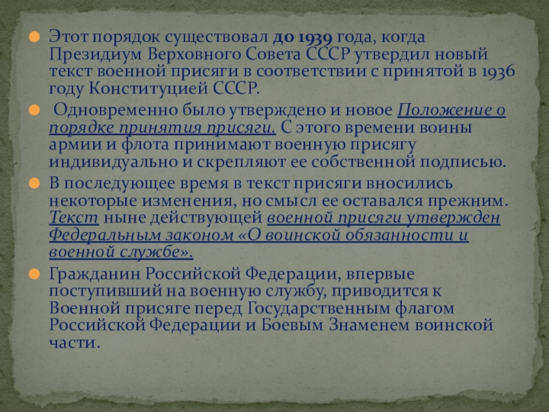В последующее время в текст присяги вносились некоторые изменения, но смысл ее оставался прежним. Текст ныне действующей военной присяги утвержден Федеральным законом «О воинской обязанности и военной службе».