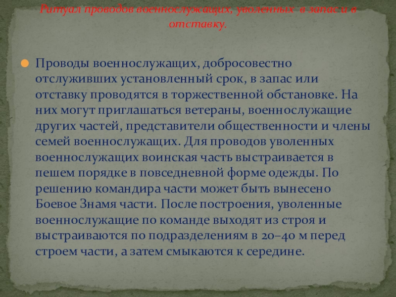 Слайд 25Проводы военнослужащих, добросовестно отслуживших установленный срок, в запас или отставку проводятся
