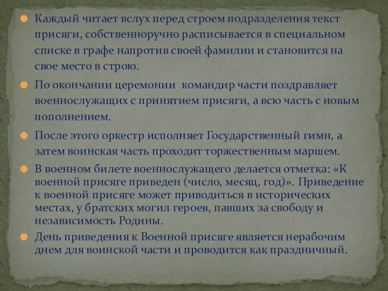 Слайд 13Каждый читает вслух перед строем подразделения текст присяги, собственноручно расписывается в