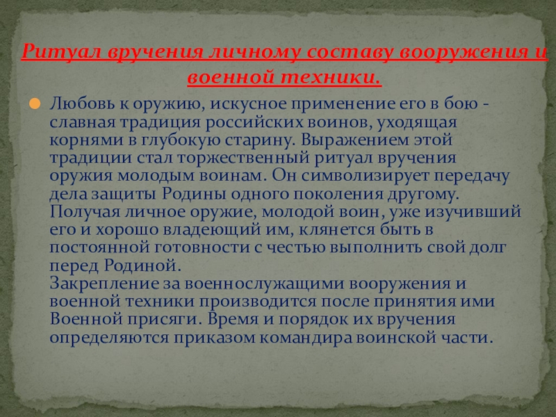 российских воинов, уходящая корнями в глубокую старину. Выражением этой традиции стал торжественный ритуал вручения оружия молодым воинам. Он символизирует передачу дела защиты Родины одного поколения другому. Получая личное оружие, молодой воин, уже изучивший его и хорошо владеющий им, клянется быть в постоянной готовности с честью выполнить свой долг перед Родиной.