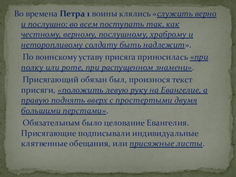 Слайд 6Во времена Петра 1 воины клялись «служить верно и послушно; во