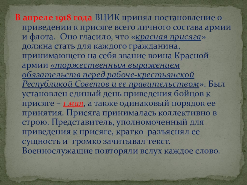 всего личного состава армии и флота. Оно гласило, что «красная присяга» должна стать для каждого гражданина, принимающего на себя звание воина Красной армии «торжественным выражением обязательств перед рабоче-крестьянской Республикой Советов и ее правительством». Был установлен единый день приведения бойцов к присяге – 1 мая, а также одинаковый порядок ее принятия. Присяга принималась коллективно в строю. Представитель, уполномоченный для приведения к присяге, кратко разъяснял ее сущность и громко зачитывал текст. Военнослужащие повторяли вслух каждое слово.