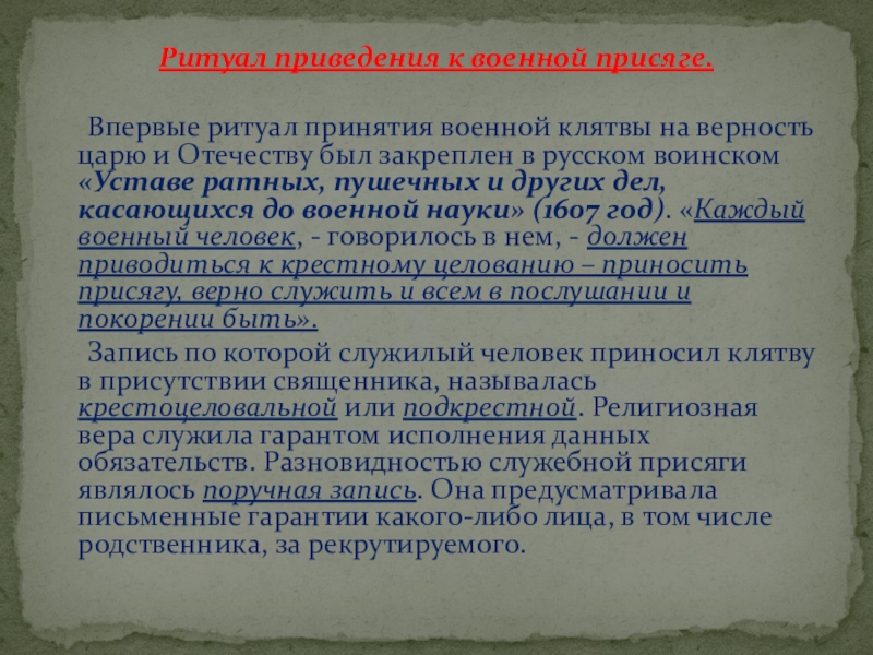 клятвы на верность царю и Отечеству был закреплен в русском воинском «Уставе ратных, пушечных и других дел, касающихся до военной науки» (1607 год). «Каждый военный человек, - говорилось в нем, - должен приводиться к крестному целованию – приносить присягу, верно служить и всем в послушании и покорении быть».