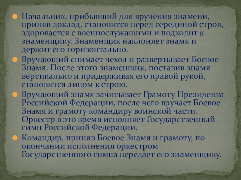 Слайд 18Начальник, прибывший для вручения знамени, приняв доклад, становится перед серединой строя,