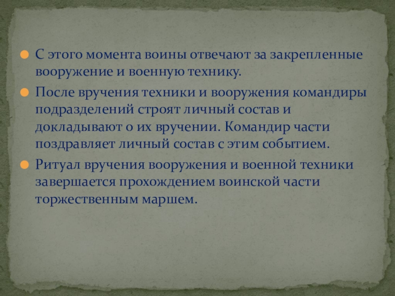 Слайд 24С этого момента воины отвечают за закрепленные вооружение и военную технику.