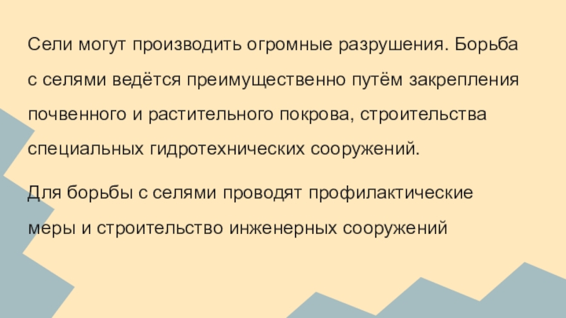 Слайд 9Сели могут производить огромные разрушения. Борьба с селями ведётся преимущественно путём