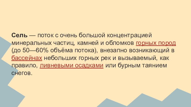 Сель — поток с очень большой концентрацией минеральных частиц, камней и обломков горных пород(до 50—60% объёма потока),