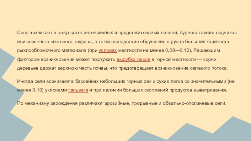 или сезонного снегового покрова, а также вследствие обрушения в русло больших количеств рыхлообломочного материала (при уклонах местности не менее 0,08—0,10). Решающим фактором возникновения может послужить вырубка лесов в горной местности — корни деревьев держат верхнюю часть почвы, что предотвращает возникновение селевого потока.