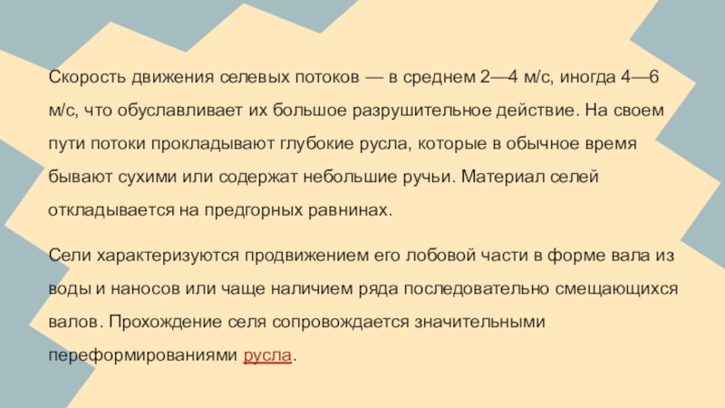 Слайд 5Скорость движения селевых потоков — в среднем 2—4 м/с, иногда 4—6